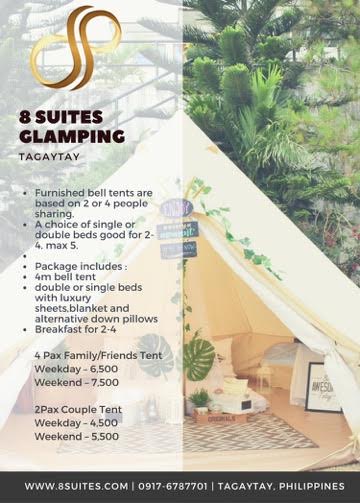 Rates start at P3190person. Family Glamping PHP 759900 Team Glamping PHP 1329900 Reunion Glamping Php 33999 PHP 459900 for two persons. 8 Suits offer glamping accommodations that you can enjoy with friends and family.